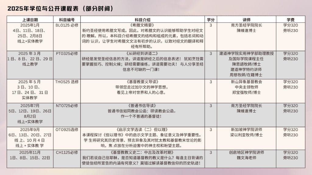 神学学位(部分时间)课程Bachelor of Theology (Part-time) 南圣神学学位(部分时间)乃是为装备信徒,持续接受系统性神学教育。本院希望栽培有心志事奉主的信徒,深化神学教育基础。神学学位(部分时间)的训练不等同于全职事奉者的训练,认证全职事奉的资格乃在于个别教会。凡持有神学证书、文凭的申请者,一旦获录取就读南方圣经学院神学学士(部分时间),学分可转移(学院保留接受或拒绝承认学分转移的权力)。 以下是神学学位(部分时间)的入学要求: 申请者需要呈交教会牧者和领袖的推荐信。已录取学员每年至少修9学分。上课人数最少要10人,才开班授课。学院可按实际情况调整。有兴趣者请联络曾佑侦姐妹 (+6017-8432285) 以下是2025年下半年开办的科目: